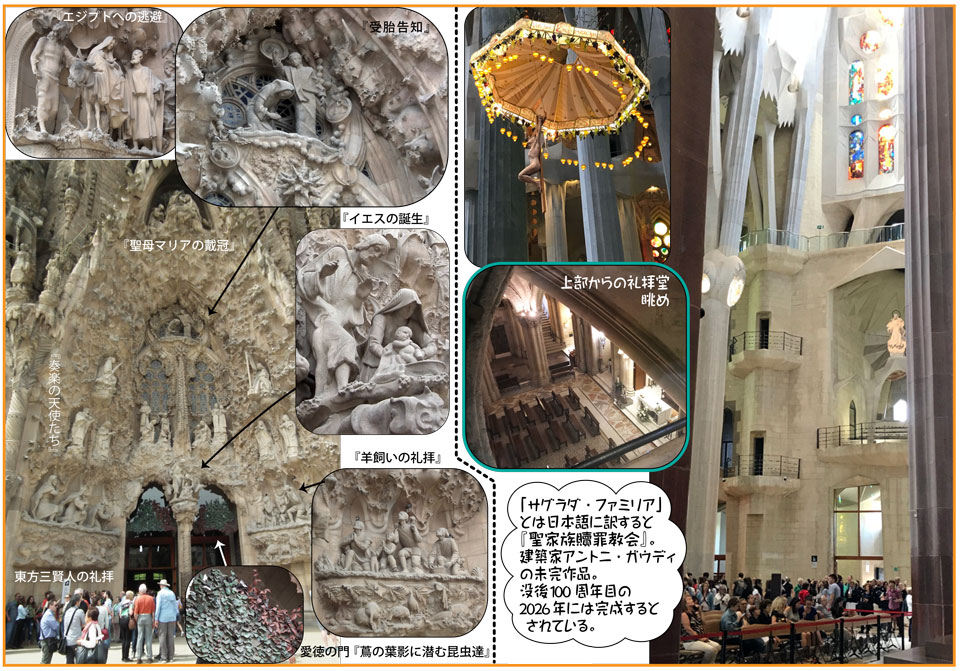 1882年に着工…136年過ぎてもまだ未完成。実際にあこがれのガウディ作品“サグラダ・ファミリア”の、巨大で複雑な形状さらに細かな装飾を目の前にすると時間がこれほどかかっているのに納得。限られた時間内で一部分の写真を撮るのが精一杯でした。沢山の観光客を避けて聖堂内を撮ったので分かりずらい動画になってしまいましたが、雰囲気は分かって頂けるかと。